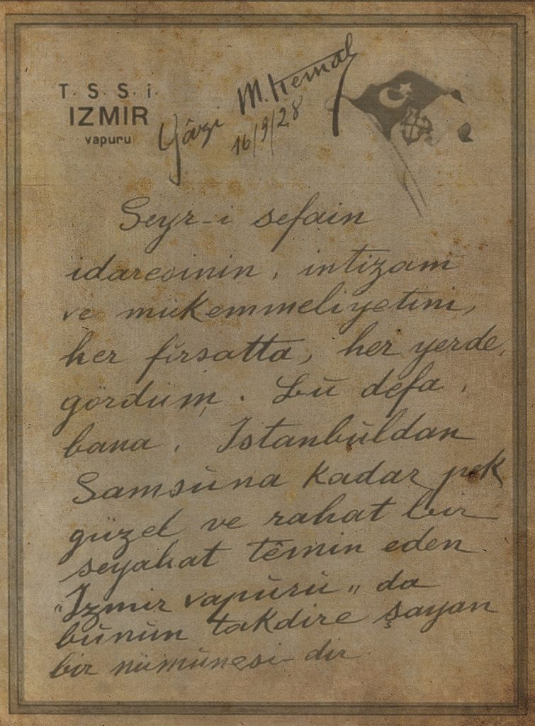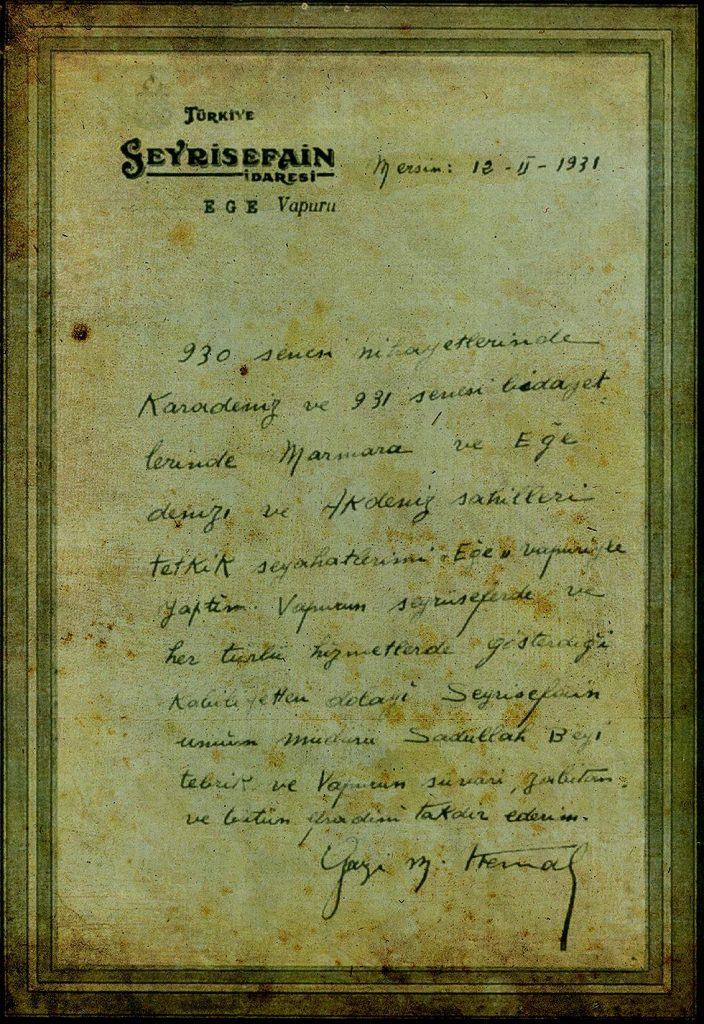 “İzmir Vapuruyla Bahri Siyah seyahatimde vapurun mükemmeliyeti ve kumanda heyeti ile efradının vazife hususunda gösterdikleri liyakattan dolayı kumanda heyeti ve Seyrisefain Müdüriyetine arz-ı teşekkür tahsin eylerim.’’ Gazi Mustafa Kemal Atatürk 19 Mayıs 1928