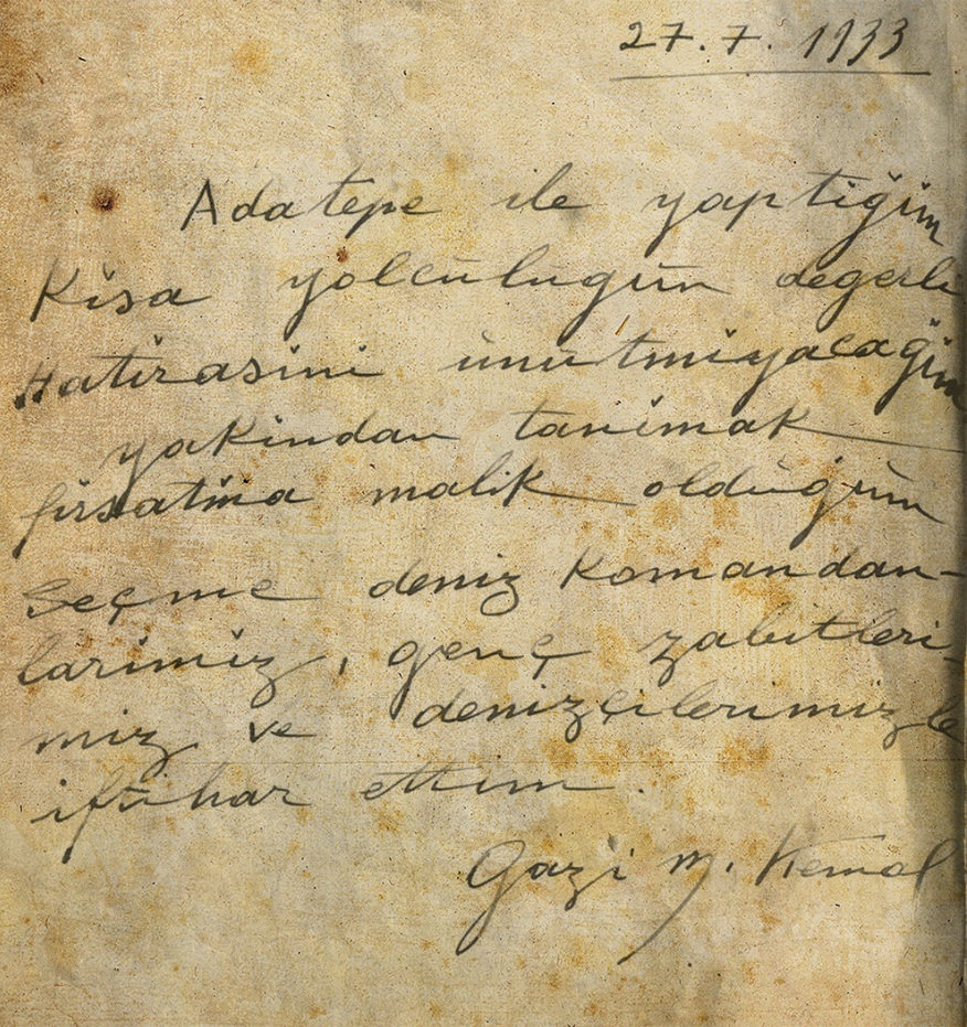 27 Temmuz 1933 tarihinde Adatepe Muhribi ile Yalova’dan İstanbul’a ve İstanbul’dan Yalova’ya seyir yapan Mustafa Kemal Atatürk, geminin hatıra defterine şu satırları yazmıştır; “Adatepe ile yaptığım kısa yolculuğun değerli hatırasını unutmayacağım. Yakından tanımak fırsatına malik olduğum seçme deniz kumandanlarımız, gemi zabitlerimiz ve denizcilerimizle iftihar ettim.’’ Gazi Mustafa Kemal Atatürk 27 Temmuz 1933