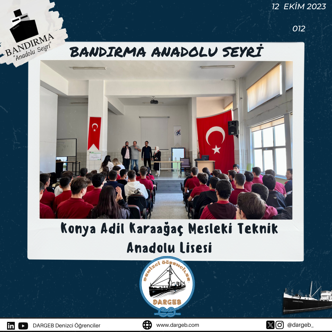 DARGEB adına Gemi Makineleri İşletme Mühendisleri Mehmet Talha Mınık ve Salih Sami Kaşıkçı, “Bandırma Anadolu Seyri” projesinin 12. durağında 12.10.2023 tarihinde Konya Adil Karaağaç Mesleki Teknik Anadolu Lisesi’ni ziyaret ederek “Mavi Vatan Perspektifinde Türk Denizciliği ve Denizcilik Fakültesi Bölümleri” sunumumuzu gerçekleştirmiştir.