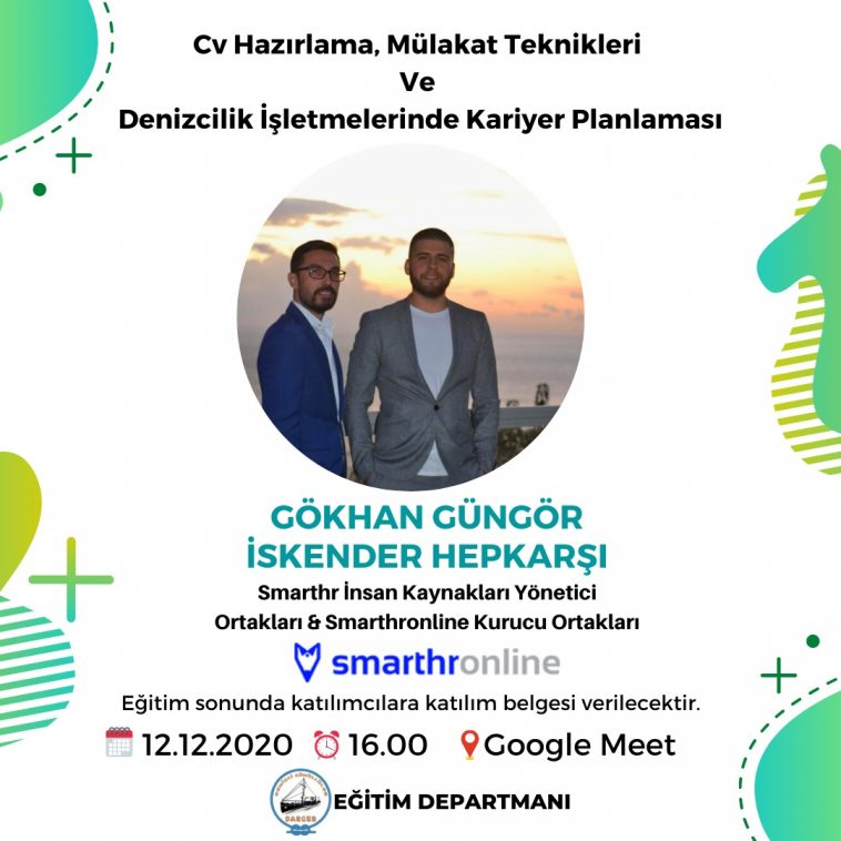SmartHr İnsan Kaynakları Yönetici Ortakları ve Smarthronline Kurucuları Gökhan Güngör ve İskender Hepkarşı ile gerçekleştirdiğimiz Cv Hazırlama ve Mülakat Teknikleri, Denizcilik İşletmelerinde Kariyer Planlaması etkinliğimize 100 den fazla öğrenci katılım sağladı.Katılan herkese teşekkür ederiz.Gelecek yayınlarda görüşmek üzere.