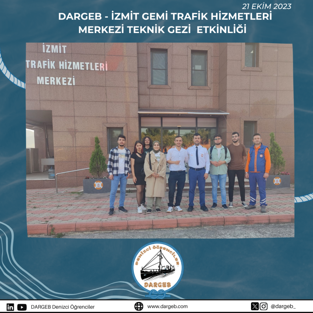 DARGEB Teknik Gezi Serilerimiz kapsamında 21.10.2023 tarihinde İzmit Gemi Trafik Hizmetleri Merkezini ziyaret ettik. Etkinliğimizde kısa bir tanışma faslından sonra bizlere Gemi Trafik Hizmetleri Merkezlerinin görevlerini, Türkiye’de nerelerde bu merkezlerden bulunduğunu, bu merkezlerin ilgilendiği deniz sahalarını aktardı. Akabinde ise İzmit Gemi Trafik Hizmetleri Merkezinin kuruluşunu ve aktif olduğu deniz sahası hakkında bizlere detaylı bilgi verdi.