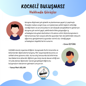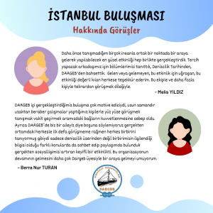 “43 üniversiteden 17 farklı denizcilik bölümlerinin birlikteliğini sağlayan Dargeb Denizci Öğrenciler birliğinden üniversite aday öğrencileriyle buluştuğumuz yine faydalı bir proje gerçekleştirmiş olduk. Mavi vatan bilinciyle bandırmanın rotasından ayrılmayan ve Atamın şu sözünü “Denizciliği Türk’ün büyük ulusal ülküsü olarak düşünmeli ve onu az zamanda başarmalıyız…”ilke edinerek öğrenci buluşmaları müze gezileri sektör öğrenci buluşmaları gibi faydalı faaliyetler gerçekleştirilmekte ve çalışmalarımızı sürdürmekteyiz.”