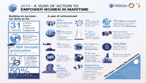 IMO, denizcilik idarelerinde, limanlarda ve denizcilik eğitim enstitülerinde kadınların belirlendiği ve kariyer geliştirme fırsatları için seçildiği bir ortam yaratılmasına yardımcı olmak ve denizcilik alanında toplumsal cinsiyet eşitliği konusunda daha fazla konuşmayı teşvik etmek için denizcilikle ilgili çeşitli paydaşlarla çalıştı. Denizcilikte Kadınlar programı, Turning the Tide filminin galasının yapılması, denizcilik sektöründeki kadınların çevrimiçi profillerinin başlatılması ve program aracılığıyla başlatılan Denizcilikte Kadın Derneklerine (WIMA’lar) destek sağlanması da dahil olmak üzere çok sayıda etkinlikle ilerleme kaydetti.