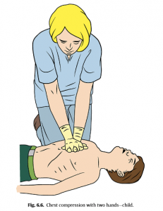 - Kalp basısı uygulamak için göğüs kemiğinin alt ve üst ucu tespit edilerek alt yarısına bir elin topuğu yerleştirilir, (çocuk yetişkin görünümündeyse yetişkinlerde olduğu gibi iki el ile kalp basısı uygulanır ) ,