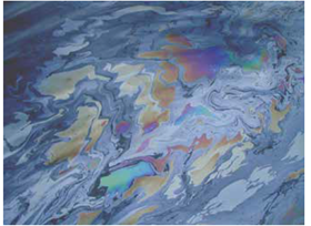 Petrol döküldüğü andan itibaren su yüzeyinde yayılma eğilimi göstermektedir. Yayılma hızı büyük ölçüde petrolün viskozitesine ve hacmine bağlıdır. Düşük viskozite yani akmazlığa sahip olan petrol yüksek viskozite olan petrole nazaran bir hayli daha hızlı yayılım eğilimi göstermektedir. Petrol henüz sıvı iken su yüzeyinde petrol tabakası olarak yayılmaktadır fakat hızlı bir şekilde parçalanmaya başlarlar. Parçalanan ve tabakası incelen petrol rengi siyahtan koyu kahverengiye dönmeye başlar. Tabaka kenarlarında ki renklerde yanardöner ve gümüş parlaklıklara doğru değişir (Şekil 2).