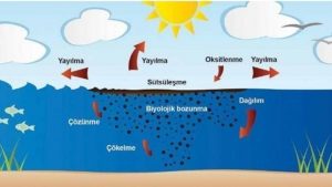 Yayılma, buharlaşma, dağılma, sütsüleşme ve çözünme bir kazara dökülmenin ilk aşamaları boyunca en önemli basamaklar olmaktadır. Çökelme ve biyolojik bozunma da petrolün nihai akıbetini tespit eden daha uzun vadeli süreçlerdir. Dağılma ve sütsüleşme süreçleri birbirine rakip süreçlerdir. Dağılma petrolü deniz yüzeyinden kaldırılan sütsüleşme kirletici madde hacminin artmasına ve petrolün mevcudiyetini devam ettirmesine sebep olmaktadır.