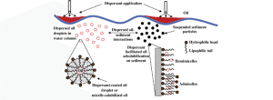Petrolün dağılma hızı petrolün niteliğine ve denizin durumuna bağlıdır. Dalgalar ve türbülans petrol tabakasının tamamını veya bir kısmını farklı ebatlarda damlacıklar halinde kırılmasına yol açabilir. Küçük damlacıklar denizde askıda kalırken büyük çaplı damlacıklar su yüzeyinde bir petrol tabakası oluşturmak için diğer damlacıklarla birleşerek su yüzeyine doğru geri çıkmaktadırlar.