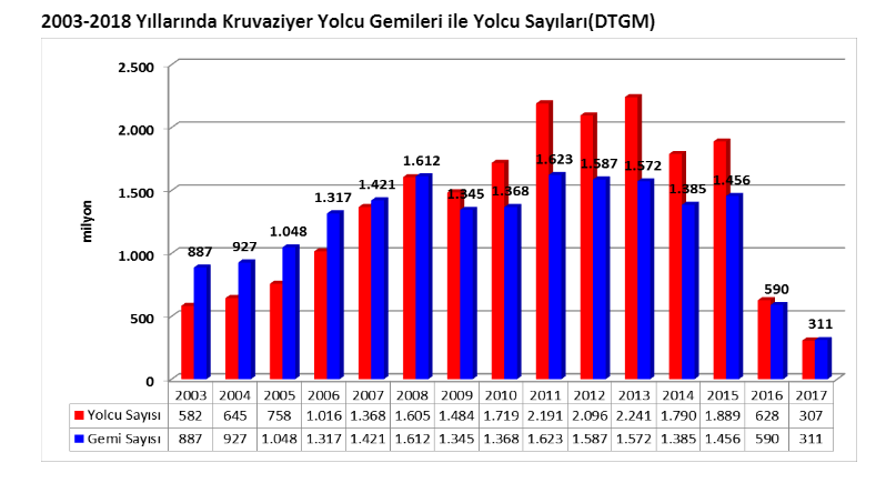 2019 yılında limanlarımıza gelen Kruvaziyer Yolcu Gemi sayısı 344, kruvaziyer gemiyle gelen Yolcu Sayısı 300.896 tür.