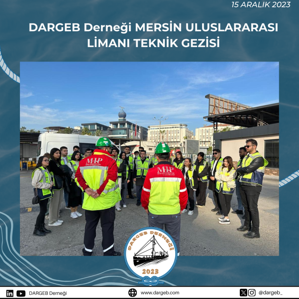 DARGEB Derneği olarak Mersin Uluslararası Limanı’nı ziyaret ederek Saha Operasyonu Sorumlusu Cihan Durukan kılavuzluğunda araç ile saha içerisinde dökme yük, sıvı yük, konteyner, konvansiyonel kargo rıhtımlarını ve bu rıhtımlara yanaşmış gemileri; CFS alanını; reefer, flatrack vb. konteynerleri; liman içi elleçleme araçlarını gözlemleyerek etkinliğimizi gerçekleştirmiş bulunmaktayız. Etkinlik organizasyonu süresince bize yardımcı olan Kurumsal İletişim Uzman Yardımcısı Muhammet Kılınç ve katılan tüm öğrencilere teşekkür ederiz.