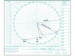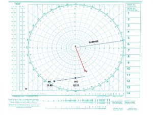 Manevra levhasının merkezini belirtmek için daima “e” harfi kullanılır. Küçük “r” harfi ise kendi gemimizin sürat vektörünün bitim noktasını belirtmek için kullanılır yani “e-r” vektörü kendi gemimizin rota-sürat vektörüdür. Küçük “m” harfi ise diğer geminin sürat vektörünün bitiş noktasını temsil etmek için kullanılacaktır. Yani “e-m” vektörü diğer geminin rota-sürat vektörüdür. Kendi gemimizin “r” ucundan diğer geminin “m” ucuna çizilen doğru “r-m” Nispi Hareket Hattı yönünü belirtir . “r-m” uzunluğu da nispi hareket süratini belirtir. Bu demektir ki nispi hareketin yönünü belirtirken başlangıç noktası daima “r” noktasıdır. Bitiş noktası ise daima “m”‘dir.
