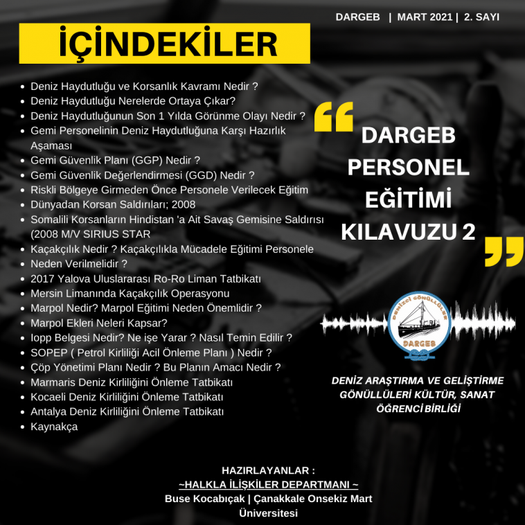 DARGEB (Denizci Gönüllüler) olarak, Limanlarda ve Gemilerde verilen personel eğitimlerini anlattığımız ve içerisinde bir çok konuya değindiğimiz “Personel Eğitimi Kılavuzu” 2. Sayısı yayımlanmıştır. Bu sayıda, deniz haydutluğu ve korsanlık kavramı nedir, riskli bölgeye girmeden personele verilecek eğitim gibi konulara yer verilmiştir. Liman ve Gemilerde Personel eğitimleri ve tatbikatlarını merak edenler kılavuzumuzu inceleyebilirler.