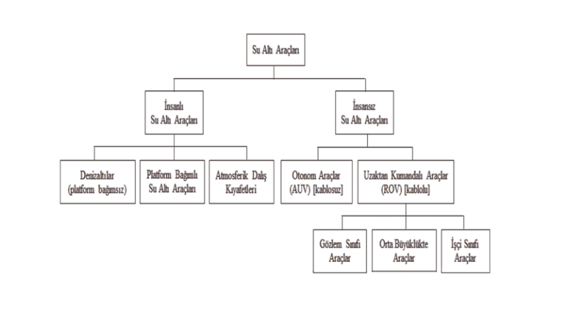 Sualtı araçları iki ana sınıfa ayrılır: İnsanlı Su Altı Araçları ve İnsansız Su Altı Araçları. Detaylı sınıflandırma aşağıdaki şekilde verilmiştir.