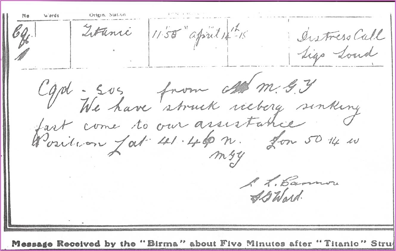 SİZLERE TITANIC FACİASI SIRASINDA BIRMA ADLI GEMİ TARAFINDAN ALINAN MESAJIN ASLINI SUNARAK TEŞEKKÜRLERİMİ SUNMAK İSTİYORUM.